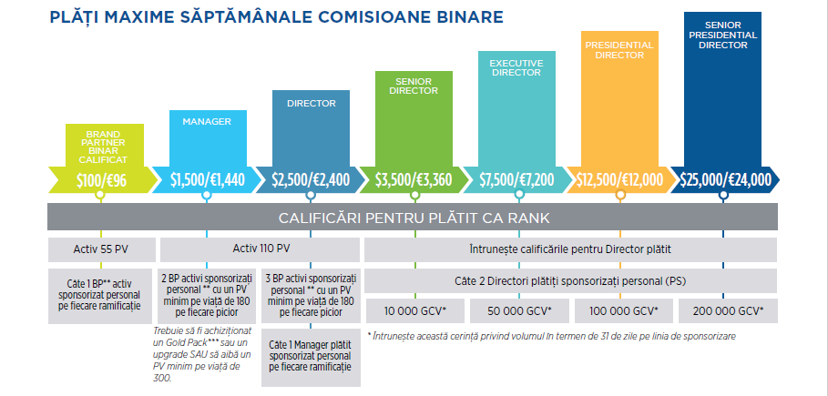 • Sponsorizezi cel puțin un Brand Partner activ pe fiecare ramură, fiecare cu un volum personal (PV) de 55 pe o perioadă de 31 de zile consecutive.